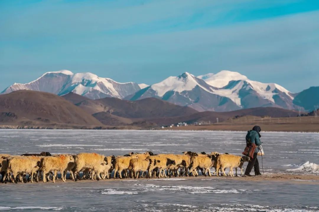 它是世界上海拔最高的村落之一,當(dāng)?shù)卮迕穸家苑拍翞樯?。寒冬?lái)臨,岸上的牧場(chǎng)草料已經(jīng)不夠羊群過(guò)冬,推瓦村的村民們把羊群集結(jié)在一起,在冰湖上撒牛糞爐灰,畫(huà)出一道冰面上的“羊腸小道”把羊群趕上普姆雍錯(cuò)湖心島上吃草過(guò)冬,雖然只有幾公里的距離,但這個(gè)傳承千年的畫(huà)面卻給人以史詩(shī)般的震撼與感動(dòng)。