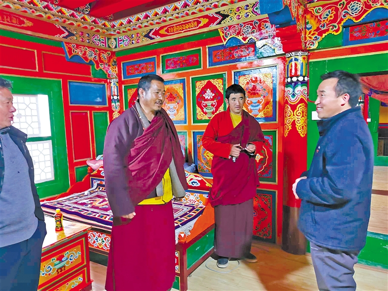 2023年11月17日,自治區(qū)人大代表段世昌(右)在昌都市江達(dá)縣汪布頂鄉(xiāng)根沙寺了解寺廟“三個意識”宣傳教育開展情況。