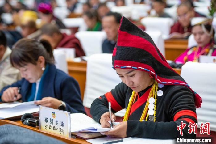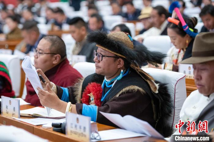 圖為西藏政協委員身著民族服飾參加開幕會。貢嘎來松 攝