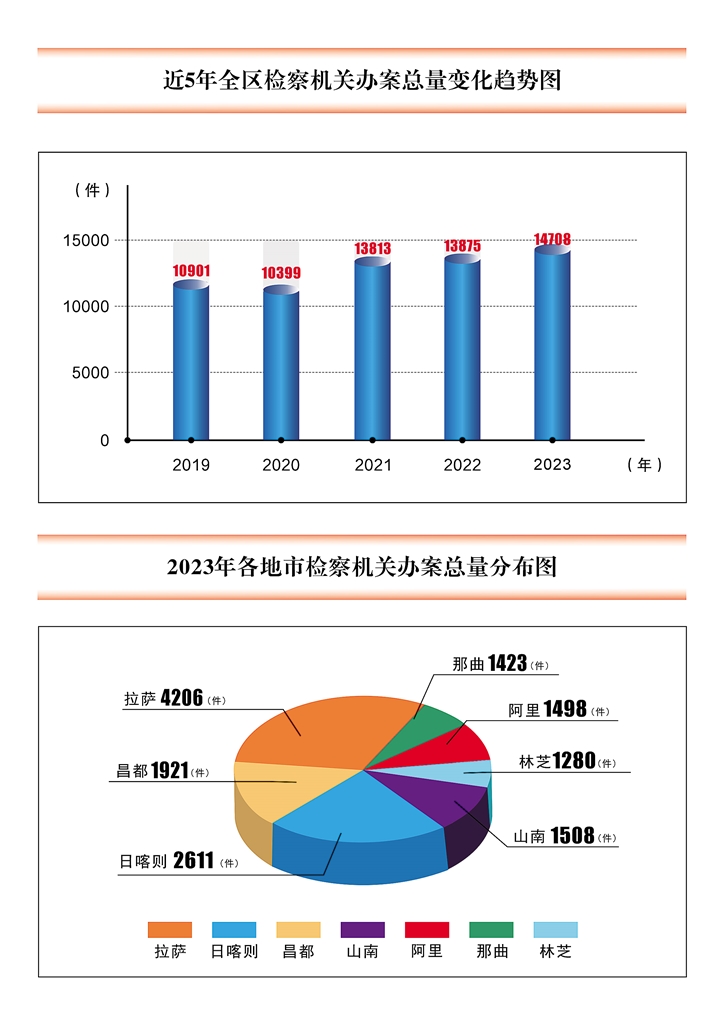 “2023年,全區(qū)檢察機(jī)關(guān)在自治區(qū)黨委和最高檢正確領(lǐng)導(dǎo)下,以習(xí)近平新時(shí)代中國(guó)特色社會(huì)主義思想為指導(dǎo),深入貫徹習(xí)近平法治思想、習(xí)近平總書記關(guān)于西藏工作的重要指示和新時(shí)代黨的治藏方略,全面貫徹黨的二十大精神、自治區(qū)第十次黨代會(huì)和十屆區(qū)黨委歷次全會(huì)精神、全國(guó)檢察長(zhǎng)會(huì)議精神,認(rèn)真落實(shí)自治區(qū)十二屆人大一次會(huì)議決議,自覺把檢察工作放到黨的治藏穩(wěn)藏興藏大局中謀劃推進(jìn),聚焦‘四件大事’聚力‘四個(gè)創(chuàng)建’,忠誠(chéng)依法能動(dòng)高質(zhì)效履職取得新成效。全年辦理各類法律監(jiān)督案件14708件,同比增長(zhǎng)6%。依法主動(dòng)辦案8030件,占54.6%,主動(dòng)辦案量首次超過被動(dòng)受理案件量?!拇髾z察’結(jié)構(gòu)持續(xù)優(yōu)化為56∶18∶7∶19,業(yè)務(wù)質(zhì)效穩(wěn)步提升。”1月8日下午,西藏自治區(qū)人民檢察院檢察長(zhǎng)夏克勤在西藏自治區(qū)第十二屆人民代表大會(huì)第二次會(huì)議上作工作報(bào)告。報(bào)告全面反映了西藏檢察機(jī)關(guān)一年來(lái)始終牢記“國(guó)之大者”,以實(shí)現(xiàn)“努力讓人民群眾在每一個(gè)司法案件中感受到公平正義”為目標(biāo),深入踐行“高質(zhì)效辦好每一個(gè)案件”,充分發(fā)揮檢察職能作用,在為大局服務(wù)、為人民司法、為法治擔(dān)當(dāng)中所做的主要工作,同時(shí)描繪了2024年的西藏檢察工作藍(lán)圖。