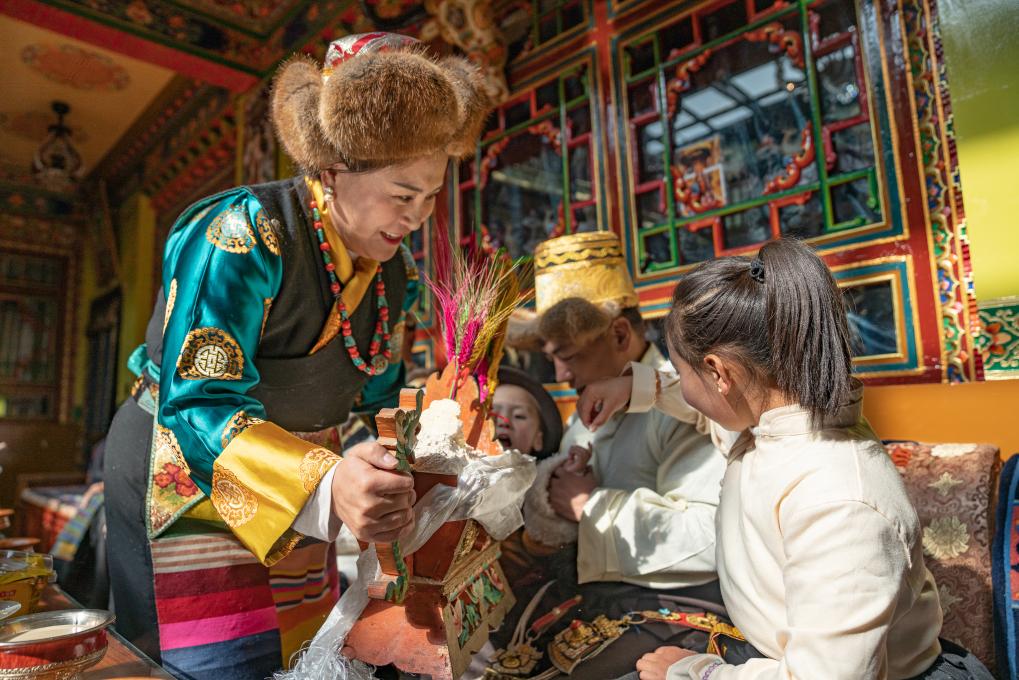 一家人按長幼次序落座,女兒次仁普尺逐一為大家獻(xiàn)上切瑪,這也是新年的重要儀式,寓意五谷豐登、六畜興旺、家和萬事興。