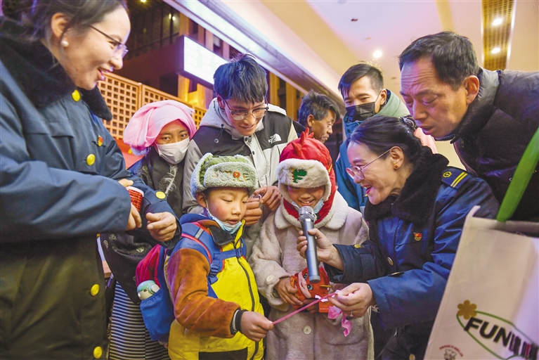春運(yùn)首日,拉薩火車(chē)站候車(chē)大廳開(kāi)展新春猜謎活動(dòng),為參與活動(dòng)的旅客送上新年伴手禮。記者 丹增群培 攝