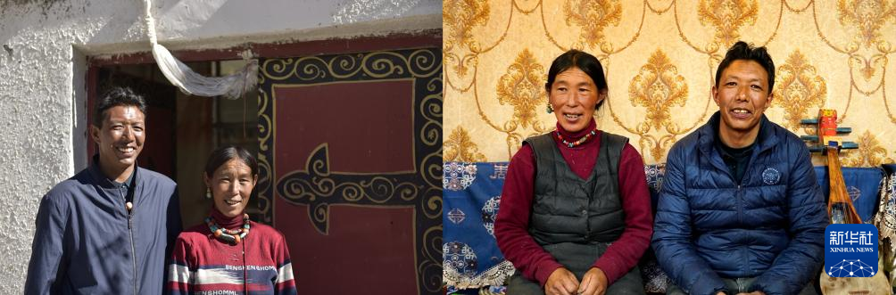 拼版照片:左圖是2021年9月19日,楚魯松杰鄉(xiāng)巴卡村村民歐珠多吉與妻子在新房門前合影(新華社記者格桑朗杰攝);右圖是2024年1月13日,歐珠多吉與妻子在新房客廳里合影(新華社記者陳尚才攝)。