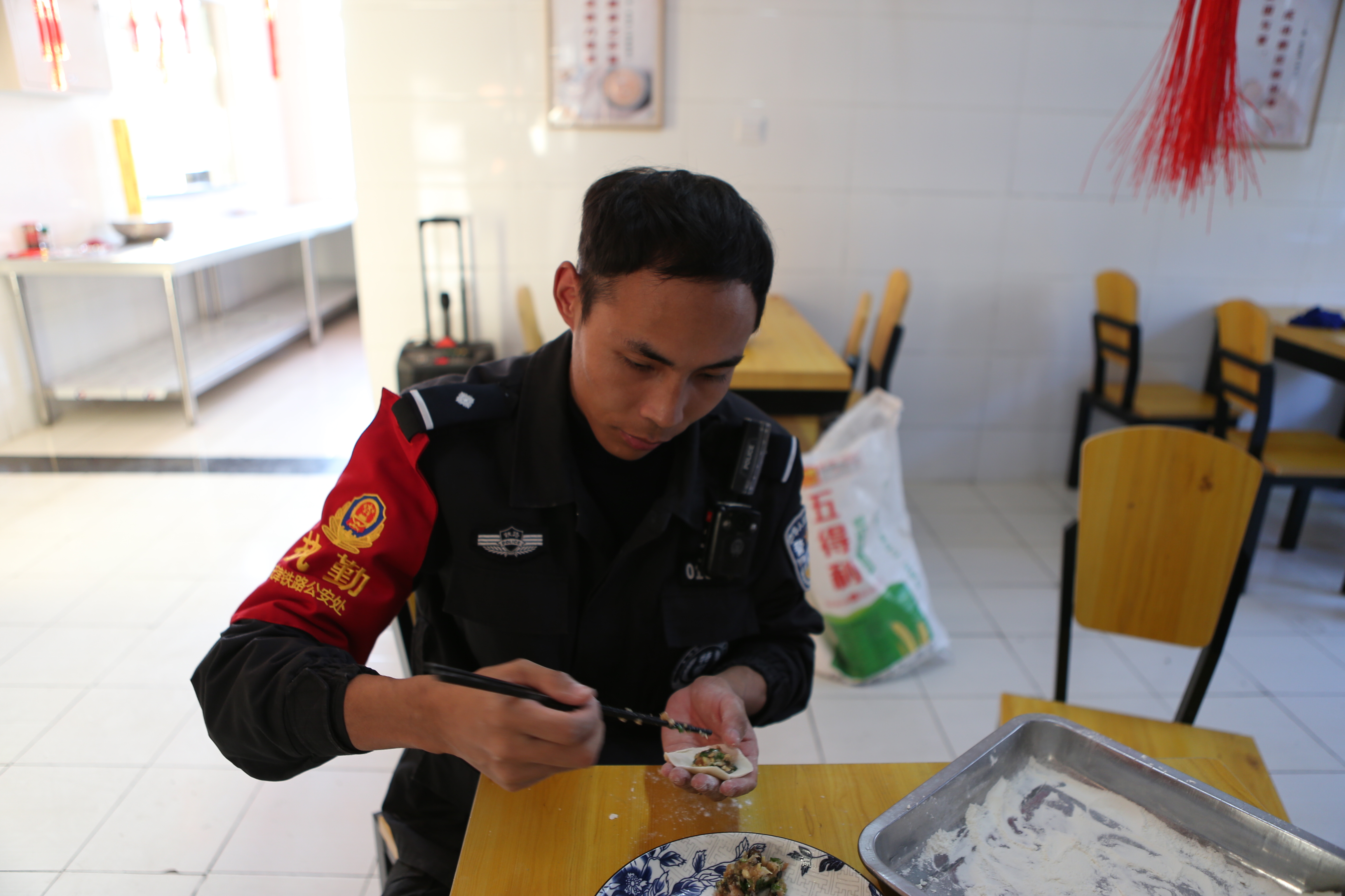 藏語里,警察被稱為“泥朵巴”(音譯)。北京鐵路公安局天津公安處特警支隊有兩名藏族“泥朵巴”,洛桑單巴和旺杰。大年三十除夕夜,他們和同事們一起歡快地包著餃子,洛桑說:“今年的農(nóng)歷春節(jié)與藏歷春節(jié)恰巧是同一天,我們今天也是過節(jié)啦!”