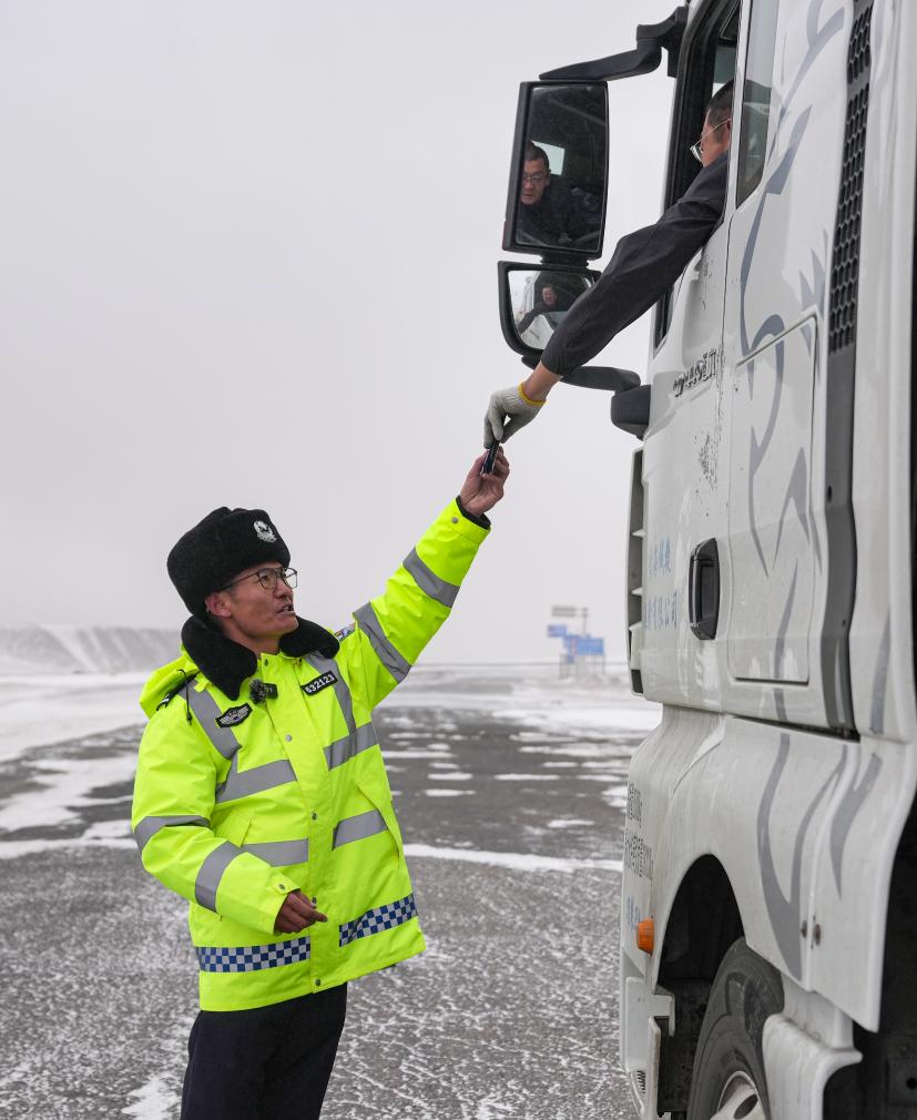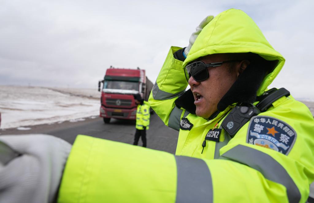 安多交警大隊(duì)秩序中隊(duì)隊(duì)長(zhǎng)達(dá)娃云旦提醒駕駛員雪天小心駕駛。新華社記者 晉美多吉 攝