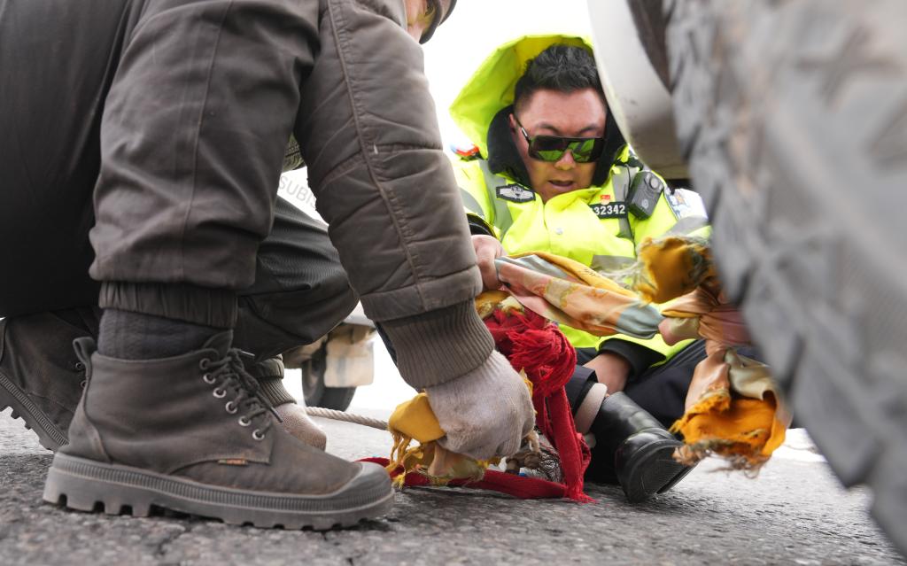安多交警大隊(duì)交警幫助故障車(chē)輛安裝拖拽繩。新華社記者 晉美多吉 攝