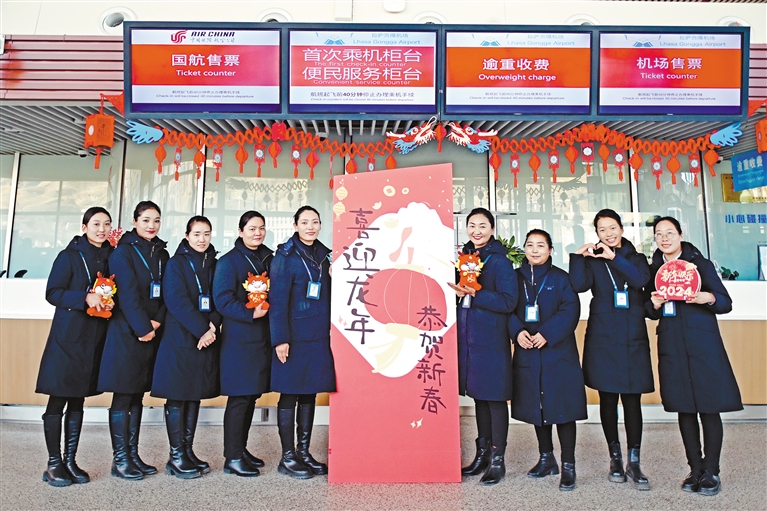 春運(yùn)期間,西藏民航人為廣大旅客架起歸途的平安天路,保障安全、順暢、高效出行。圖為貢嘎機(jī)場旅服部工作人員在航站樓現(xiàn)場為旅客送上新年祝福。