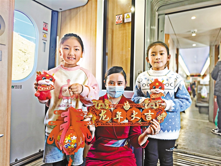 春運(yùn)期間,鐵路部門踐行“天路格?;ā狈?wù)品牌理念,將車站、列車裝飾一新,為旅客提供優(yōu)質(zhì)、貼心的服務(wù)。圖為拉林鐵路動(dòng)車組上的乘務(wù)員把龍年禮物送給孩子們。