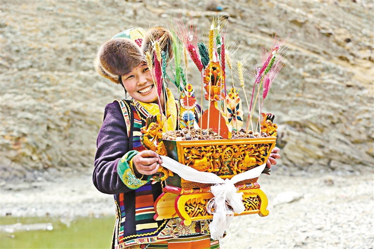 制作“切瑪”盒是藏歷新年一項(xiàng)歷史悠久的習(xí)俗,代表著群眾對(duì)五谷豐登的美好期盼。圖為瓊結(jié)縣唐布齊村群眾身著節(jié)日盛裝,端出精心制作的“切瑪”盒。