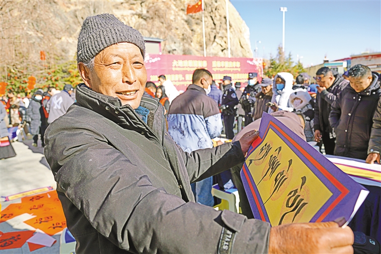 山南市文聯(lián)組織書法家走進(jìn)瓊結(jié)縣,開展“我們的中國夢(mèng)——文化進(jìn)萬家”活動(dòng)。圖為群眾展示獲贈(zèng)的藏文書法作品。