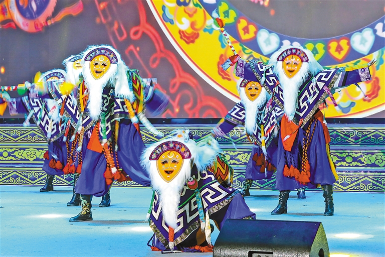 洛扎縣組織縣藝術(shù)團(tuán)、農(nóng)牧民表演隊(duì)等精心舉辦“大地歡歌 美麗洛扎”村晚。圖為村晚上的藏戲表演。