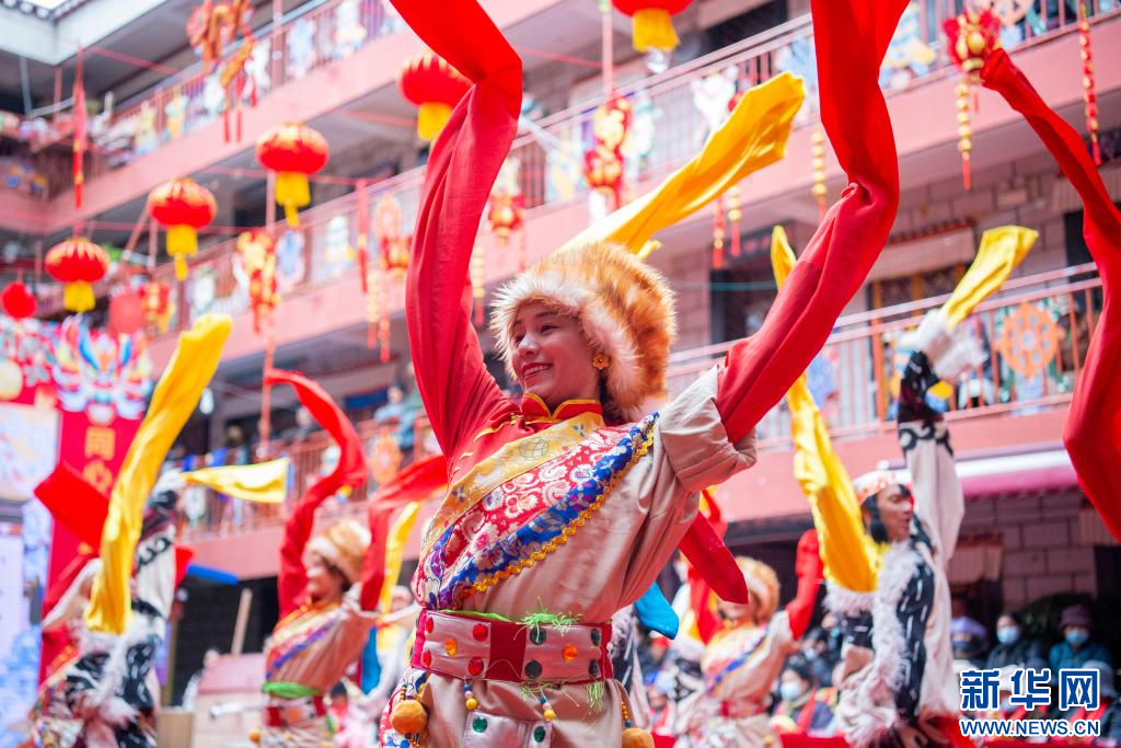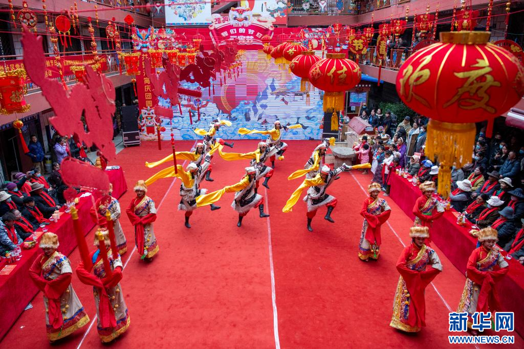 2月23日,拉薩市城關(guān)區(qū)娘熱鄉(xiāng)民間藝術(shù)團的演員在德賽大院里表演。新華網(wǎng) 旦增努布 攝