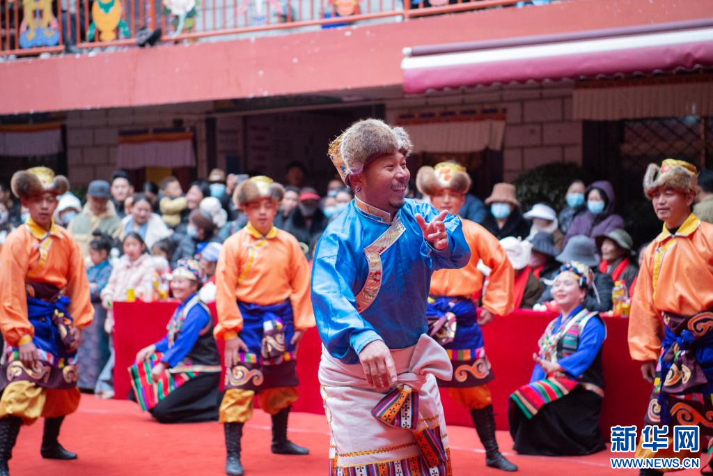 2月23日,拉薩市城關(guān)區(qū)雪巴拉姆藝術(shù)團的演員在德賽大院里表演。新華網(wǎng) 旦增努布 攝