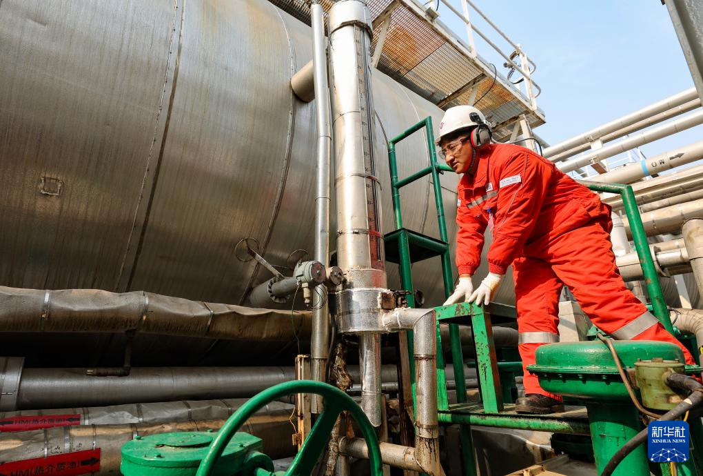 強(qiáng)巴在秦皇島32-6油田“渤海世紀(jì)號(hào)”(FPSO)16萬(wàn)噸級(jí)浮式生產(chǎn)儲(chǔ)油裝置上檢查原油油樣(3月7日攝)。新華社記者 姜帆 攝