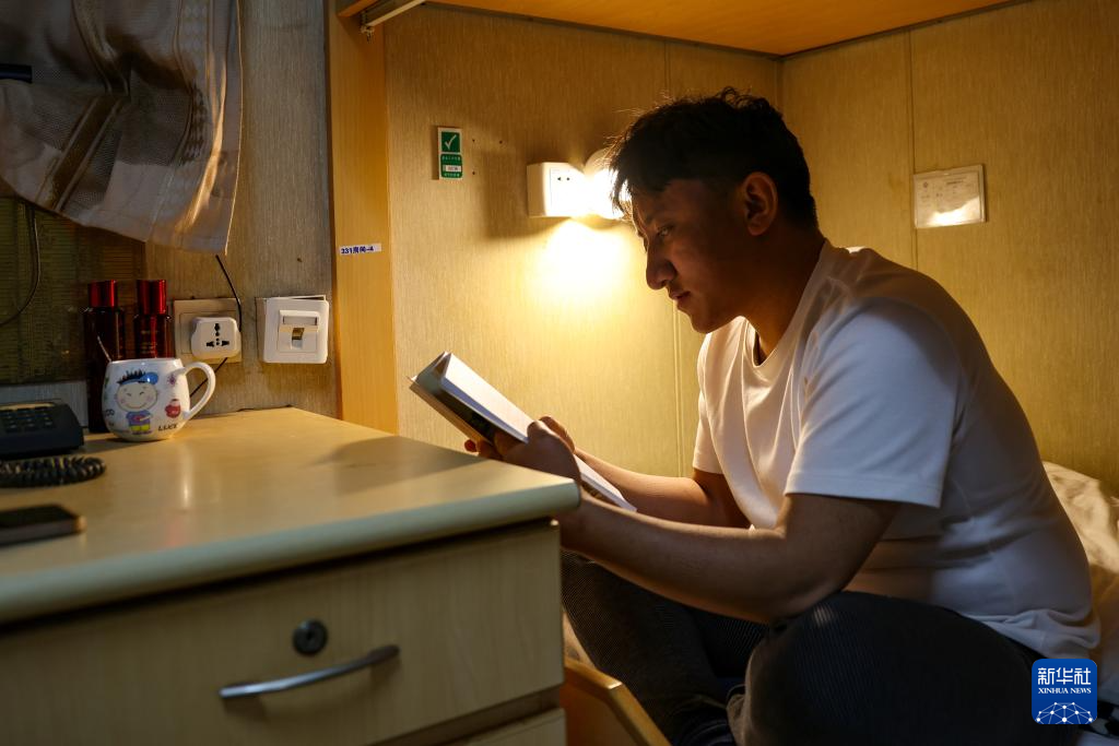 強(qiáng)巴在秦皇島32-6油田“渤海世紀(jì)號(hào)”(FPSO)16萬(wàn)噸級(jí)浮式生產(chǎn)儲(chǔ)油裝置上休班的時(shí)候進(jìn)行業(yè)務(wù)學(xué)習(xí)(3月7日攝)。現(xiàn)在他正準(zhǔn)備中級(jí)操作工資格的考試。新華社記者 姜帆 攝