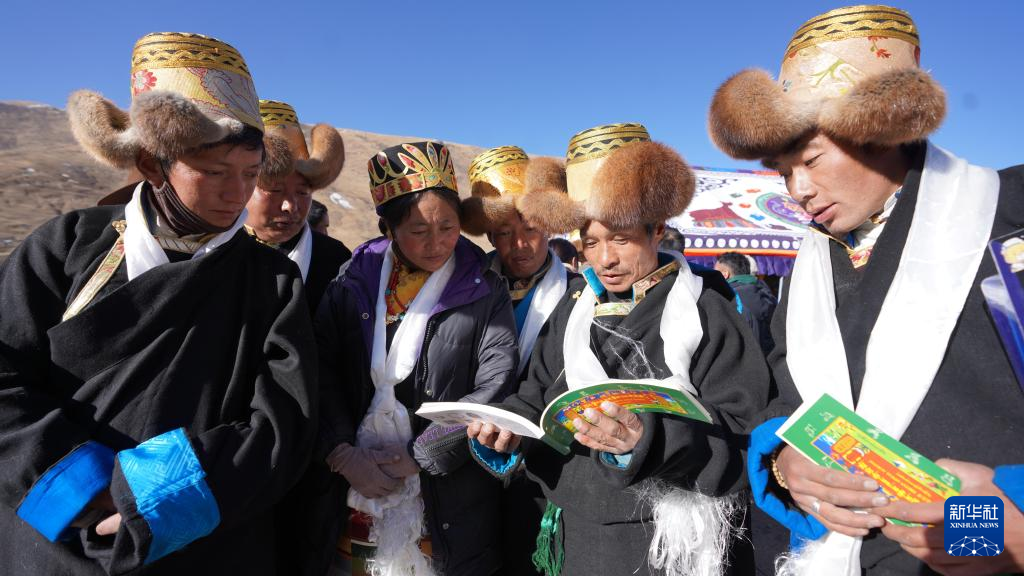 唐加鄉(xiāng)村民在達(dá)布天文觀測(cè)臺(tái)旁翻看2024年藏歷(3月9日攝)。(次昂玉珍 攝)