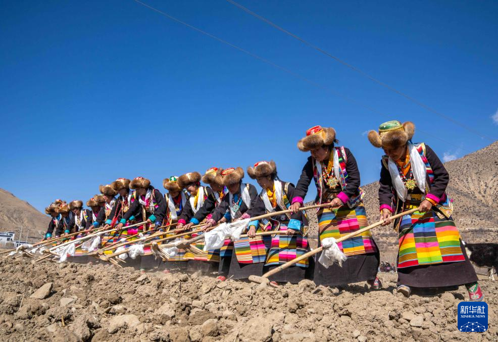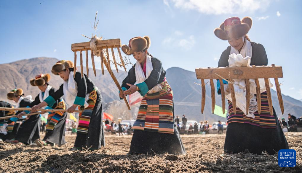 當日是西藏農(nóng)民舉行一年一度春耕大典的日子。村民沿襲著傳承千年的春耕民俗,身著節(jié)日盛裝,手捧“切瑪”(五谷豐登斗),唱起祈愿歌,互敬青稞酒。當鐵犁翻開土地,婦女將手中的種子撒下,祈求新的一年豐收。