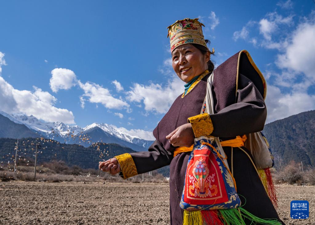 3月16日,在西藏林芝市工布江達縣巴河鎮(zhèn)秀巴村的春耕儀式現(xiàn)場,農(nóng)民播撒種子。新華社記者 孫非 攝