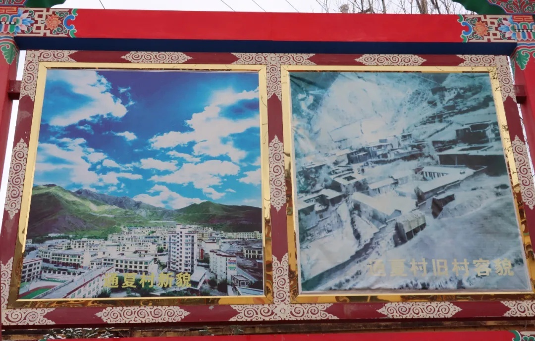 而在通夏村門口,兩幅照片十分顯眼,一幅是通夏村新貌,一幅是舊貌。在舊貌中,低矮的土平房在大雪積壓下,東零西落地散布在起起伏伏的坡面上,冰雪覆蓋的泥濘小道幾乎無法通行?!斑@樣的土坯房我和先輩們住了幾十年,更早以前,甚至都沒有房子,放牧到哪里,帳篷就支到哪里?!苯衲?3歲的村民達瓦扎巴指著老照片說。而在一旁新貌圖中,蔚藍的天空下一幢幢藏式小樓整齊林立,寬敞的水泥路通家達戶,一派欣欣向榮的景象……