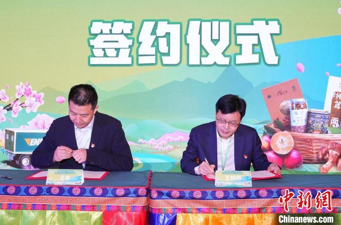 圖為中國(guó)郵政集團(tuán)有限公司西藏自治區(qū)分公司黨委書(shū)記、總經(jīng)理王樹(shù)橋(圖右)與西藏供銷(xiāo)集團(tuán)董事長(zhǎng)王豐簽約。中國(guó)郵政集團(tuán)有限公司林芝市分公司供圖。