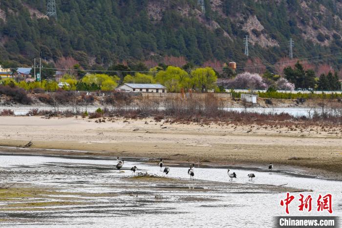 圖為黑頸鶴在河邊覓食。貢嘎來松 攝