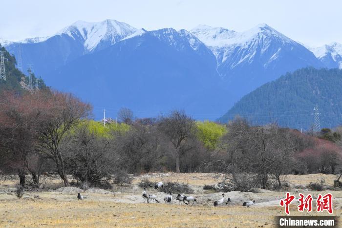 圖為黑頸鶴在田間覓食。貢嘎來松 攝