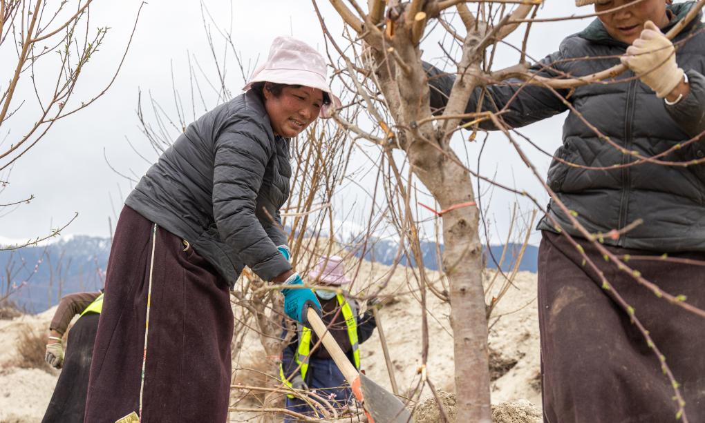 “這里以后也會成為桃花園!”56歲的嘎拉村村民尼瑪曲吉說。在嘎拉村外尼洋河的河灘上,她和村民們正在種桃樹,挖坑、正苗、培土,累了就唱幾句藏歌。聽到記者叫了一聲“阿佳”(藏語大姐之意),尼瑪曲吉熱情招手。
