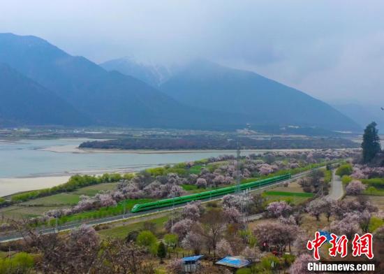 復(fù)興號(hào)動(dòng)車組不僅是一種便捷的交通方式,更成為了一種獨(dú)特的旅游體驗(yàn),讓游客能夠近距離欣賞到西藏林芝春季獨(dú)特的自然美景。圖為穿梭在桃花林中的拉林鐵路高原復(fù)興號(hào)。