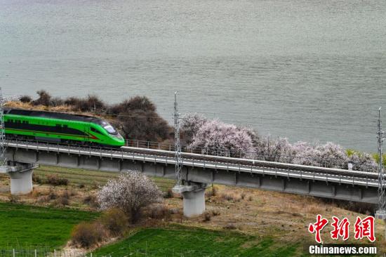 據(jù)悉,拉林鐵路是一條連接西藏拉薩市與林芝市的國(guó)鐵Ⅰ級(jí)單線電氣化鐵路,全長(zhǎng)435公里,設(shè)計(jì)時(shí)速160公里,于2021年6月25日開通運(yùn)營(yíng)。圖為穿梭在桃花林中的拉林鐵路高原復(fù)興號(hào)。