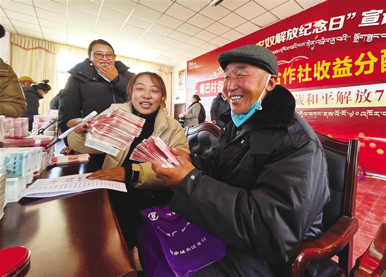 拉薩市城關(guān)區(qū)納金鄉(xiāng)嘎巴村分紅儀式現(xiàn)場(chǎng)?!∥鞑厝?qǐng)?bào)記者 旦增蘭澤 攝