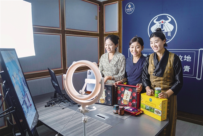 網(wǎng)絡(luò)主播在巴青縣“赤堆東雄”網(wǎng)紅直播間推介當(dāng)?shù)靥厣r(nóng)牧產(chǎn)品?!⌒氯A社記者 孫非 攝