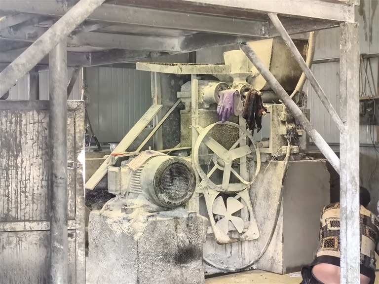 4月10日11時(shí)許,記者跟隨城關(guān)區(qū)市場(chǎng)監(jiān)管局執(zhí)法人員穿過(guò)米瓊?cè)账淼?,?lái)到一處由幾間簡(jiǎn)易鐵皮房圍建而成的院落。該院落臨近米瓊?cè)丈铰?,從外面看,任誰(shuí)也想不到這里是一家制粉廠(chǎng)。院落左側(cè)有一間不足60平方米的加工室,室內(nèi)一個(gè)寫(xiě)有“粉料攪拌機(jī)”字樣的儀器上,布滿(mǎn)了白色污垢。