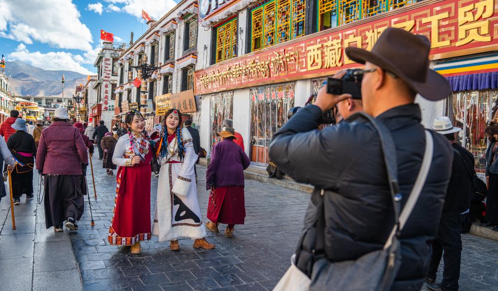 游客在八廓街街道上拍照留念。新華社記者 丁增尼達攝
