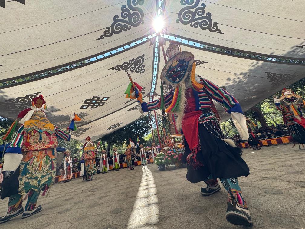 廣場中央戲臺上,鼓點輕快、鈸聲鏗鏘,戴著黃面白發(fā)面具的藏戲演員唱腔高亢激昂;臺下,觀眾聚精會神,不時隨著演員表演一起大笑。