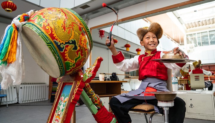 藏戲小演員為表演伴奏。新華社記者 丁增尼達 攝