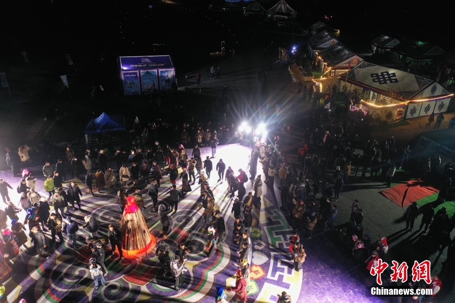5月18日晚,西藏拉薩市當(dāng)雄縣納木錯湖畔,當(dāng)?shù)啬撩駧в慰腕w驗篝火鍋莊舞。納木錯,被譽為“天湖”,吸引著大量游客前來觀光。圖為牧民帶游客體驗篝火鍋莊舞現(xiàn)場。