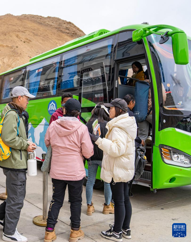 游客在珠穆朗瑪國家公園內(nèi)排隊(duì)換乘環(huán)保大巴車(5月20日攝)。
