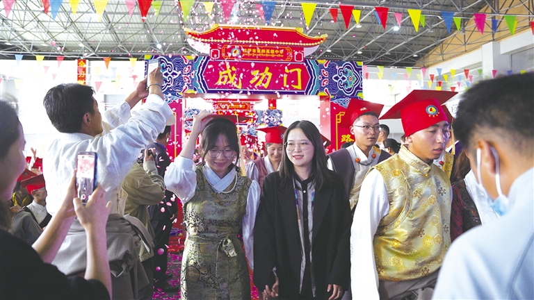 活動(dòng)現(xiàn)場(chǎng),每一位即將畢業(yè)的學(xué)生都要穿過(guò)象征著“成人、成才、成功”的三道門。家長(zhǎng)代表手捧鮮花,不停地叮囑著孩子;老師們眼眶濕潤(rùn),看著即將離校的學(xué)生,充滿了不舍和期待。此刻,千言萬(wàn)語(yǔ)涌入心間,匯成美好的期盼。