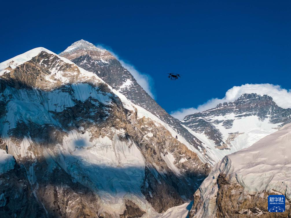 4月30日,大疆運(yùn)載無人機(jī)在珠穆朗瑪峰尼泊爾一側(cè)進(jìn)行物資運(yùn)輸測試(視頻截圖)。新華社發(fā)