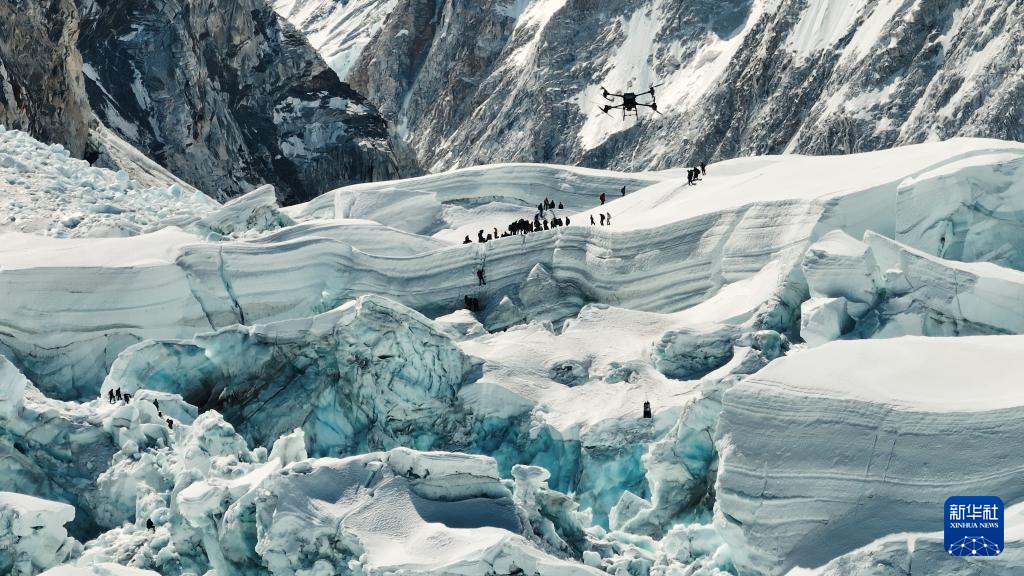 4月30日,大疆運(yùn)載無人機(jī)在珠穆朗瑪峰南坡昆布冰川進(jìn)行物資運(yùn)輸測試(視頻截圖)。新華社發(fā)