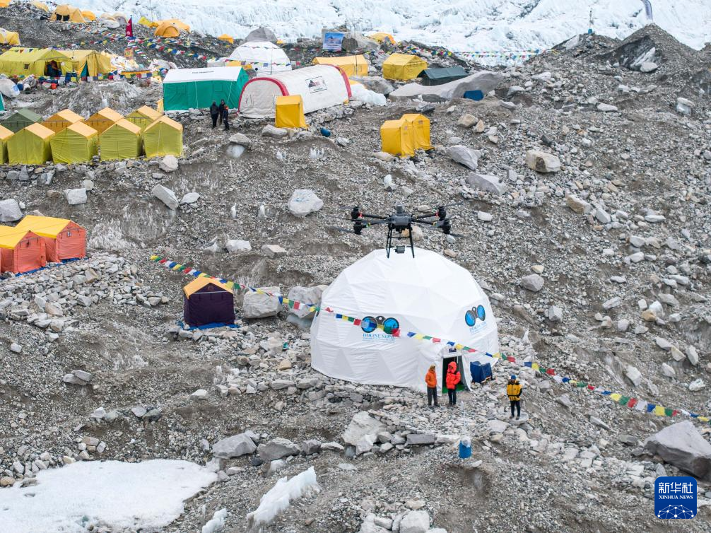 4月30日,大疆運(yùn)載無人機(jī)在珠穆朗瑪峰南坡大本營進(jìn)行物資運(yùn)輸測試(視頻截圖)。新華社發(fā)
