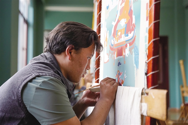 唐卡,2006年被列入國家非遺名錄,其題材豐富,包含歷史、文化和生活。昌都嘎瑪嘎赤畫派傳承人羅珠巴松出生在唐卡世家,是嘎赤派大師烏欽·敦德拉松的后代,他自幼學(xué)習(xí)唐卡,7歲啟蒙,8年筑基,19歲獨(dú)立創(chuàng)作,21歲收徒,31歲被認(rèn)定為自治區(qū)級非遺傳承人,41歲被認(rèn)定為國家級非遺傳承人。在西藏嘎欽唐卡畫院,他分享了自己學(xué)習(xí)、傳承發(fā)揚(yáng)唐卡的故事。