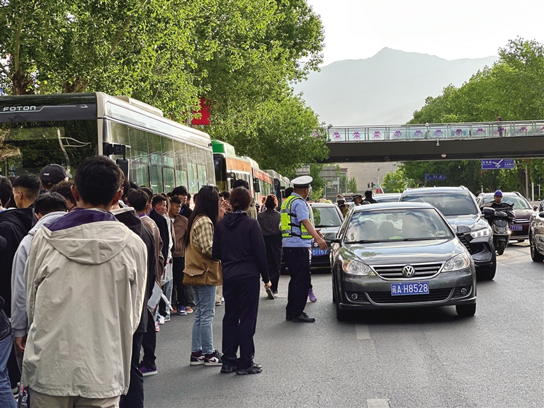 6月7日8點(diǎn),太陽(yáng)剛剛升起,拉薩中學(xué)考點(diǎn)附近人頭攢動(dòng)。一輛輛愛(ài)心送考的公交車依次??吭隈R路邊,學(xué)生們排隊(duì)等候安檢進(jìn)場(chǎng),考點(diǎn)大門口的喇叭重復(fù)播放著考生進(jìn)考場(chǎng)的溫馨提示。