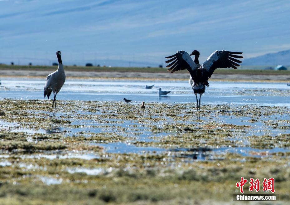 圖為黑頸鶴幼崽在父母的引導(dǎo)下在濕地里棲息、覓食。貢嘎來松 攝