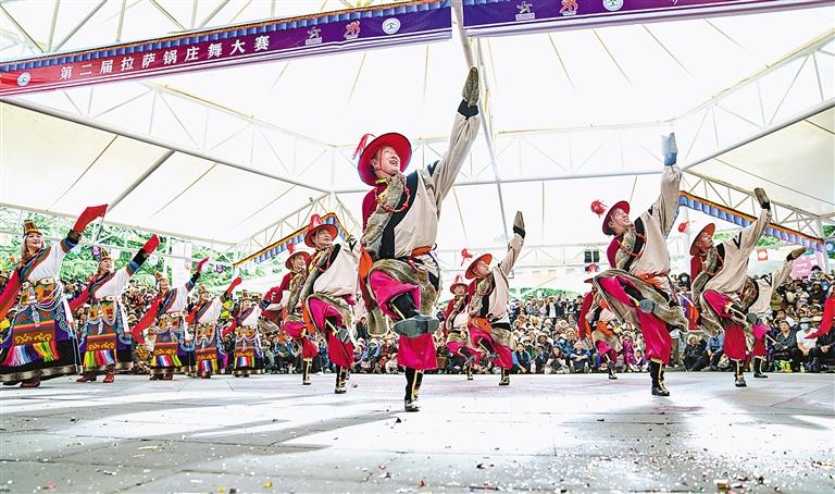 圖為參賽者在第二屆拉薩鍋莊舞大賽現(xiàn)場(chǎng)表演。新華社記者 丁增尼達(dá) 攝
