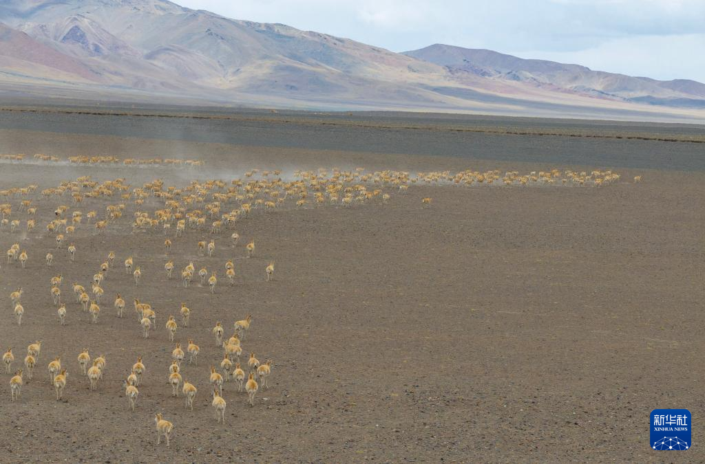 一群藏羚羊因感覺到危險而開始奔跑(無人機(jī)照片,6月13日攝)。新華社記者 姜帆 攝