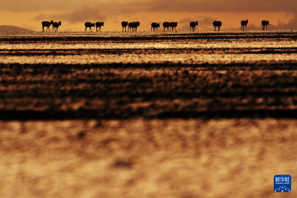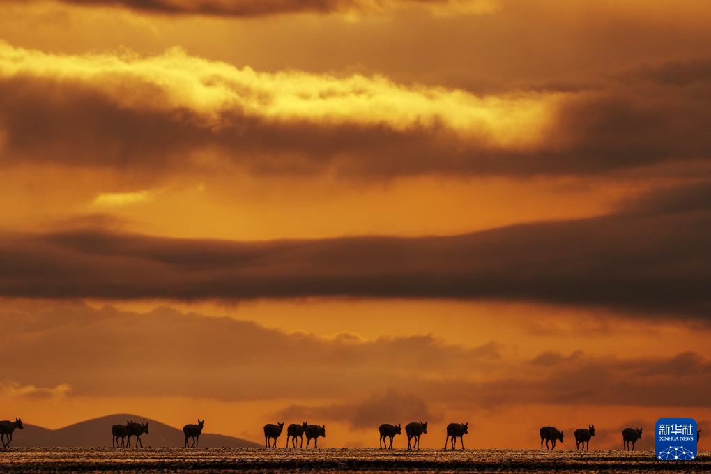 6月14日,在西藏那曲市尼瑪縣境內(nèi)的羌塘國家級自然保護(hù)區(qū)“無人區(qū)”深處,一群藏羚羊迎著朝陽,行進(jìn)在遷徙路上。新華社記者 費茂華 攝