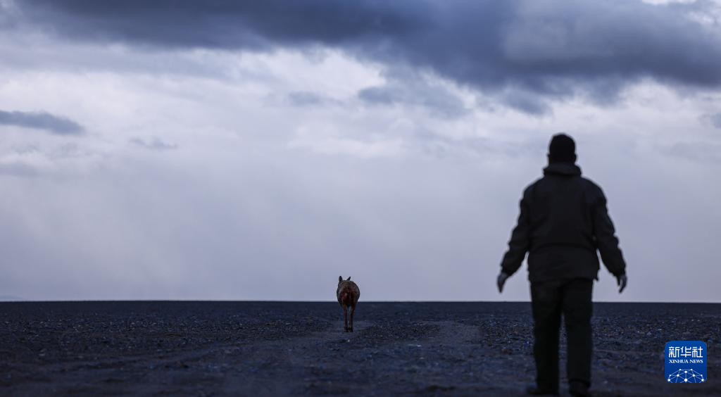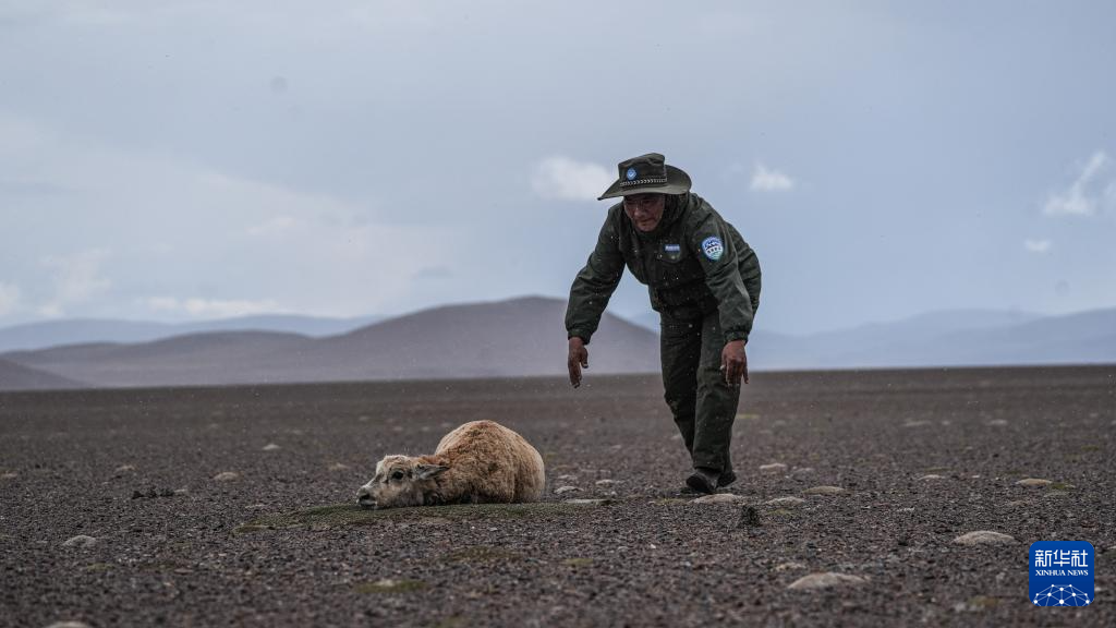 羌塘國家級自然保護(hù)區(qū)的野保員上前查看受傷的母藏羚羊(6月14日攝)。新華社發(fā)(旦增攝)