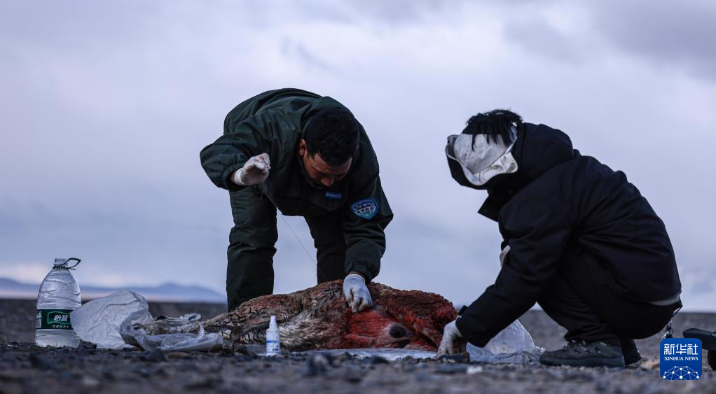 羌塘國家級自然保護(hù)區(qū)的野保員在查看受傷的母藏羚羊(6月14日攝)。新華社記者 晉美多吉 攝