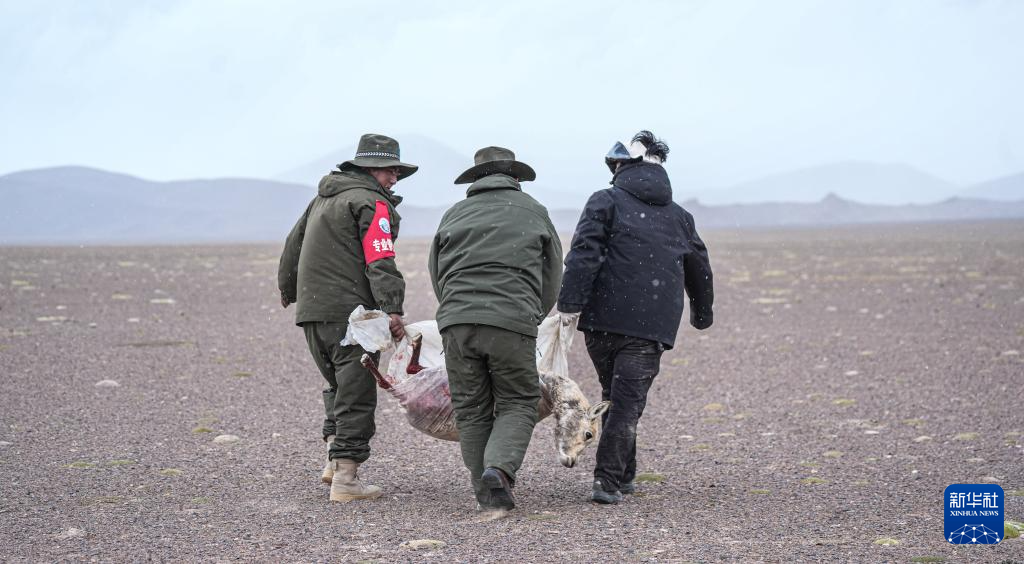 羌塘國家級自然保護(hù)區(qū)的野保員把受傷的母藏羚羊抬到臨時營地附近(6月14日攝)。新華社發(fā)(旦增攝)